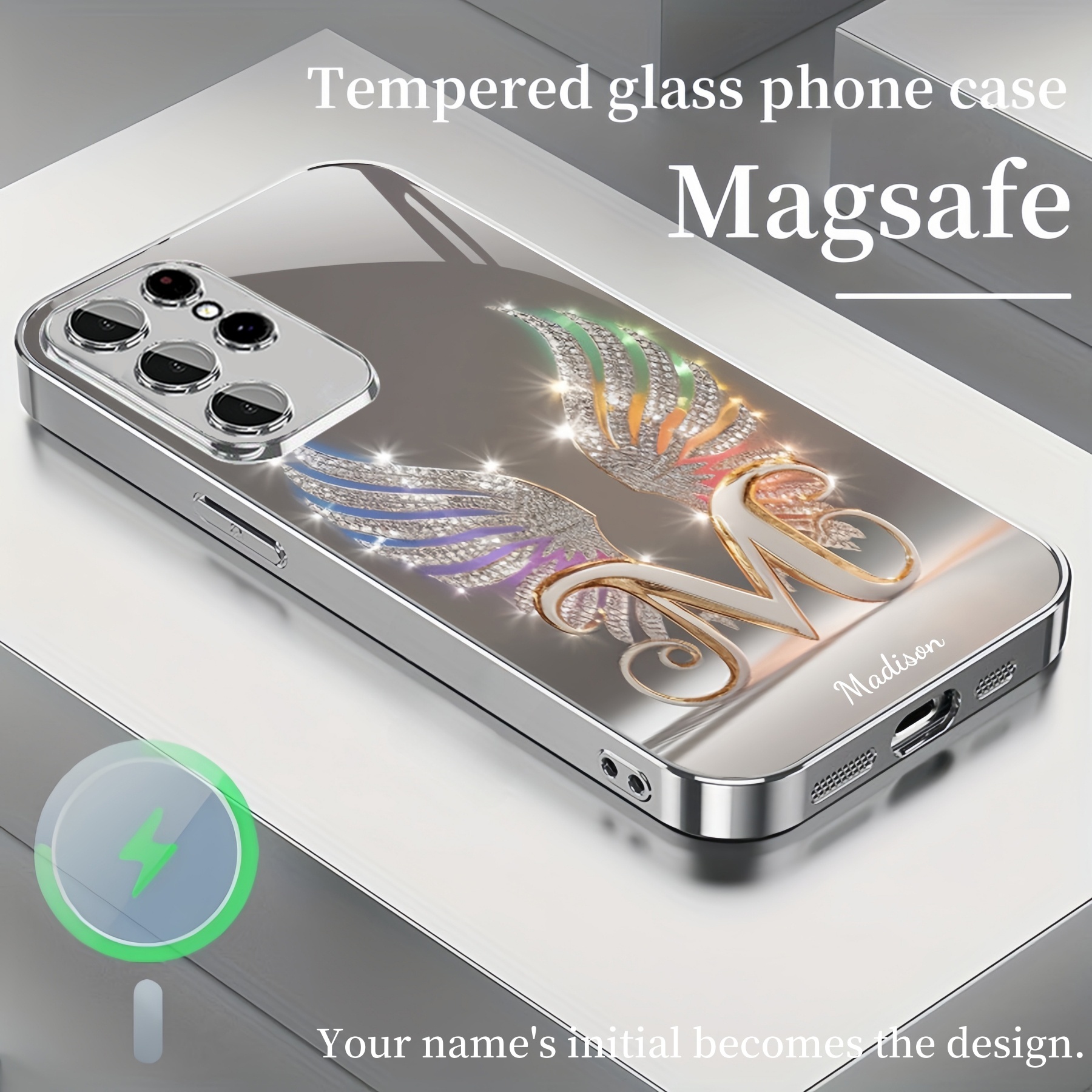 Personalized Diamond Wings Initial & Name Magsafe Tempered Glass Plating Case